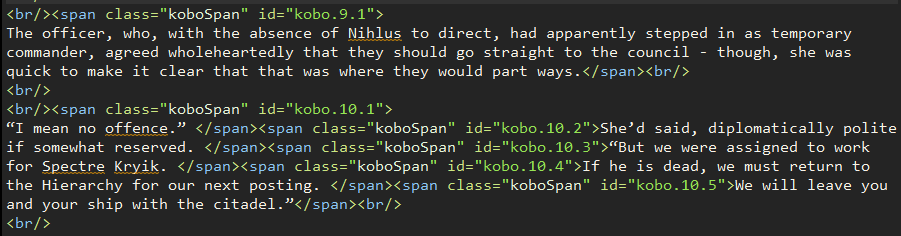I was having a look at the code of the KePub that I am reading. I was wonder what the reasoning is for the multiple koboSpan spans in some paragraphs? Are they needed or would KePub work with just one koboSpan per paragraph?