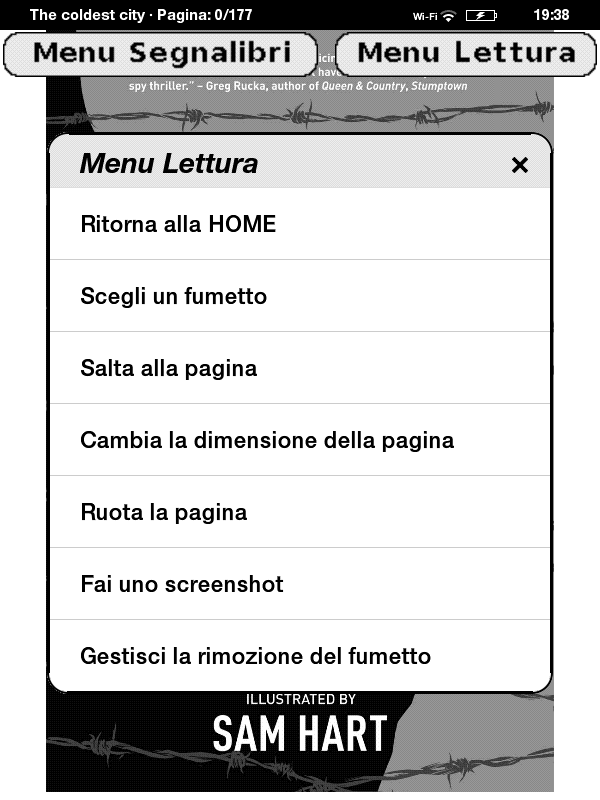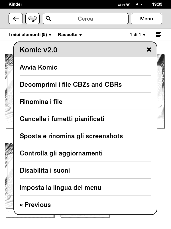 ![]() I removed the old reading menu and bookmarks menu and placed instead two new kindle-style menus. This helped me reducing the amount of button images to be localized (now 14). I changed the html range input with a new jquery ui to choose the scroll amount. I also localized the launcher menu and added a new script to change the menu language according to the system language. All scripts (rename/delete/move screenshots/decompress archives/check updates/sounds) use now localized on-screen instructions. Finally, both Komic and its launcher menu have en_GB/it_IT languages and they use english as fallback language (i.e if they can't find a correct translation, they will use english). New languages can be added, if someone wants to help, please let me know (it's an easy job, although there is quite a huge amount of strings to be translated )And now some screenshot (in italian obviously )