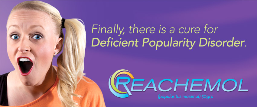 Has any one else seen the Reachemol ads that have been popping up on billboards all around the country? I'd never even heard of DPD (Deficient Popularity Disorder), but it's nice to know there's a drug for it!