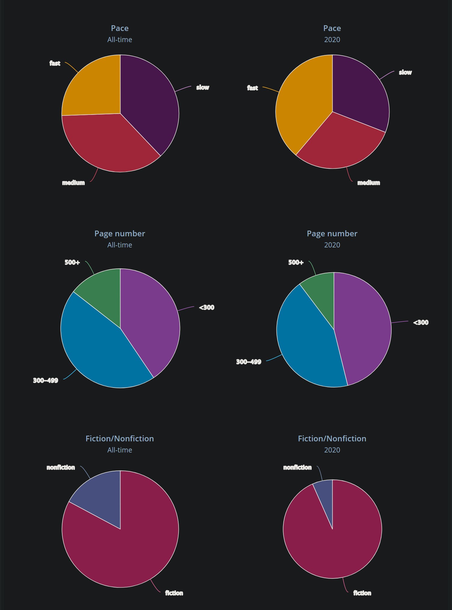 I'm the same. A side-by-side comparison of my all-time stats versus 2020 stats at The StoryGraph shows a clear preference this year for shorter and faster-paced, and for fiction over nonfiction