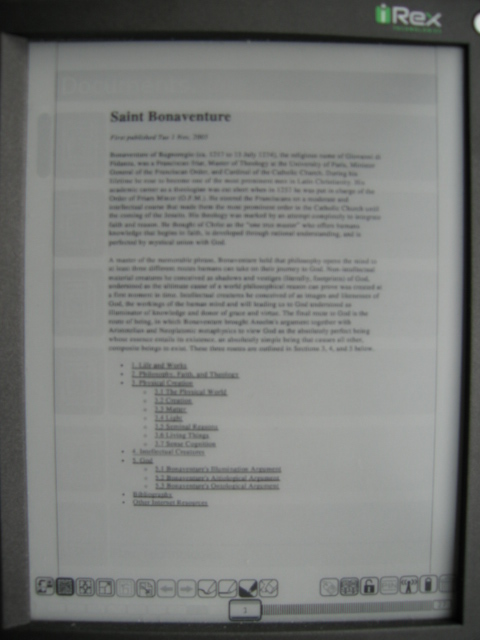 The screen is amazing, much more white than the first, the first units screen was more like my sony reader, more gray than white, this unit looks very much like paper, the contrast is incredible, the black is so dark it looks like sharpie marker on printer paper. There is almost no ghosting at all anymore, it is so faint that if you are not looking for it you will never see it, it is very easy to read now, no lines between the lines anymore. I also loaded the new FW and they have made some great changes, glad to see the improvements in wifi conectivity as well as the calibration unit. Thanks iRex for fixing my unit, it is now much closer to the price I paid for it ![]() Now if we can only get some US newspapers to sign and some way to auto upload RSS feeds via wifi every day then this will be a real contender to standard print and PC reading. G |