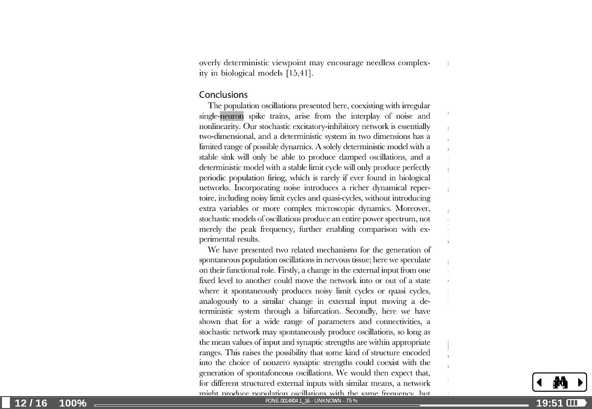 @captainralf: ok, done the little test. Adobereader makes a mess of the physics file, while pdfviewer is ok. Search: adobeviewer took about 55 second (I was counting in my head ) to complete the search of the word "neuron": the words are visualised in the column, and if you tap on them you are sent to the relevant page. In Pdfviewer the same search took less than three seconds (if that), and all words are shown highlighted already in the page. Bear in mind, though, that there is still an important bug in pdfviewer, namely that in landscape mode you cannot move from the top part of the page to the bottom part - so for the time being we are stuck in portrait mode. EDIT: below the internal pictures of the files - first the physics in Adobeviewer, then the same in pdf viewer. Next two pictures are search mode and corresponding page in Adobeviewer, and the following two same thing for pdfviewer. Final picture is one page in pdfviewer with minimal zoom - non very visible. As for light, what I meant was that whatever light is fine for a paper book, is also fine for the PB903, at least for me. Last edited by paola; 05-07-2011 at 05:31 PM. |