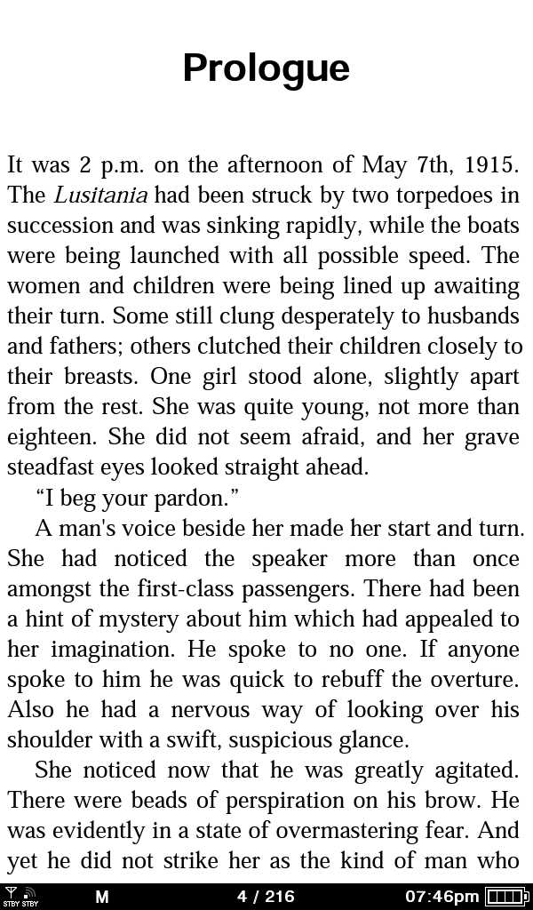 SRF, here is the screen shot you asked for for "How To Tell A Story". As you can see, the text is very bold. JSWolf, here are the screen shots for the Agatha Christie story, before and after stripping out the embedded font. The (embedded) picture shows the Fontin very nicely, but interestingly enough, the (device) picture shows the Charis..... NOT BOLDED. I confess this is unexpected. This would seem to indicate that the culprit is NOT the PRS+ software but rather something in the individual book CSS files? But this is the FIRST book out of dozens I've tested that hasn't gone all bolded on me. I'm even more confused now than before! ![]() The CSS for the Agatha Christie file, for comparison to Young Fredle is: Code: