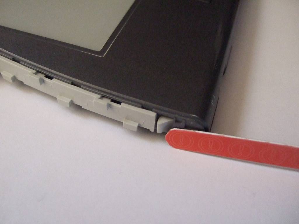 Here is how you insert a fine nail file or any similar object that will let you pry the plastic corner just a little bit so you can put the file in parallel to the border and then gently push it in: As the file goes in like 2 cm., a plastic hook will give in from its position, where it holds the corner cap in place by resting against an inner wall of the cap. The cap is already removed here so you can see the hook: When the cap is unhooked it can be slid a few millimetres along the reader border, and then removed by pulling to the side: Both the latch and inner wall can be seen to both sides of the file here for your convenience so you can imagine how they come together when in place: Repeat the process with the three remaining corners. Now you want to make sure you removed the stylus and torx screws and start prying the case open from the edge where the ports are with the file, just a little bit, from its centre. After the grey case halves come apart a bit at the corners, it's time to pry from the sides. Each corner has several openings on the back side of the white plastic frame where you can insert a flat head screwdriver and very gently pry so the back case half starts coming apart from the corner up: The plastic stubs between every two openings that hold the back case into place will likely get damaged as can be seen in image #5, or even broken off (they are very fragile). Don't worry, the case will still fit snugly anyway, and then there are the corner caps. After you are done with opening the first lower corner, do the other lower one, then do the two upper ones gently, from the reader side centres to the corners, and when you are done do NOT pull the back case out, remove it like it is hinged to the front case on the upper side, so the latch that holds both together near the stylus holder won't break. You can replace your battery now. Last edited by MrWarper; 03-12-2018 at 04:05 PM. Reason: Thumbnail images  |