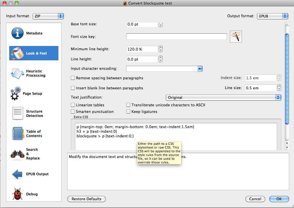 Add that to Calibre in a new book record. Then convert, go to the 'Look and Feel' section, and paste the following lines in extra CSS: Code: