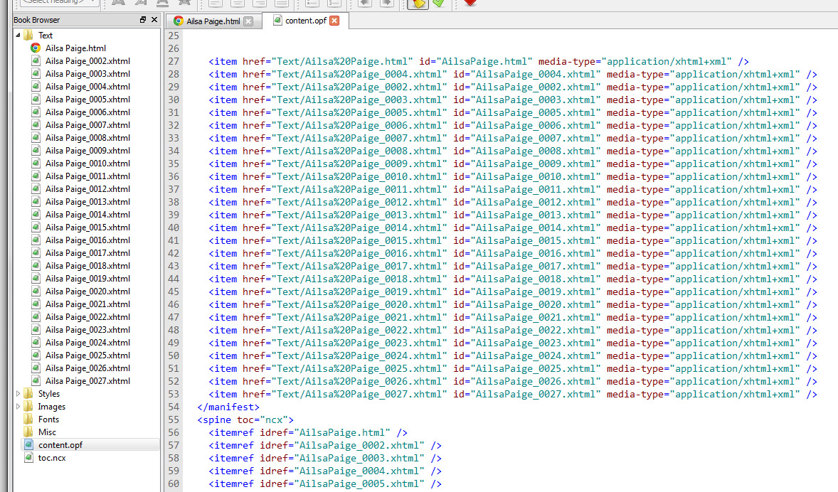 We were worried there might have been some side-effect of the changes that were made to fix the issues with chapter splitting, but it seems this is not the case. The spine retains the logical ordering of the files as specified in the Book Browser, and there's nothing that breaks the standard or produces an incorrect output. The only place where ordering matters in the opf is in the spine. Outside that, this is essentially the same as the other issue about the ordering of a metadata attributes - it just doesn't matter, and any program that assumes things will occur in a certain order is broken. The ids used have no purpose other than to allow the spine to reference items in the manifest. It could be fixed, but the cost would be to slow the program down unnecessarily and introduce more things that could go wrong. Remember that the opf file is only meant to be read by an XML parser - in fact one of the points of Sigil is that it removes the necessity to code or alter it yourself except in specialised circumstances. I'm having trouble thinking of anything you might want to edit in the manifest or spine that you couldn't do much more easily and safely in the Book Browser. Sigil uses filenames for the ids more as a matter of coding convenience than anything else. Again, this is code that's only meant to be read by an XML parser and making it easier to read doesn't confer any functional benefit. So, it might get changed at a later date if the code is refactored, but I really wouldn't worry about it. |