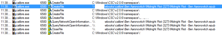 For the procmon vs. built-in "open file" discrepancy, keep in mind that procmon shows you a lot more information than anything else. For example, I just ran procmon tracing file system activity on calibre.exe startup and did indeed see "CreateFile" operations on epub files. On the surface that looks damning, so let's dig a little deeper. Right-click, Properties. Now we're getting somewhere. On the "Event" tab you can see that the Desired Access is "Read Attributes". So this isn't actually opening the file. This is getting the file attributes, a much lighter file IO access than actually opening (and reading) the file. Just to confirm, click on over to the Stack tab and you can see that calibre is trying to get the length of the file (PyObject_Length), which makes an underlying GetFileAttributesExW call, which never actually calls a CreateFile or OpenFile method. So all is good.
