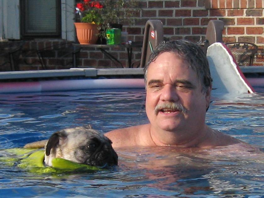 ![]() Issybird already mentioned the outdoor pool at the local university. I'd like to mention the backyard pool my wife bought makes me and Norton happy. He's a freak behind swimming. All he has to do is hear me say the words "pool" or "swim" or see me getting my trunks on and he goes bonkers! I do wish it were an in-ground pool so that 85-pound Crystal could join us as well, but I did order a set of booties for her last night that hopefully will enable her to join in the fun without ripping the liner to shreds. This photo is about three years old. I really need to take some new pictures. Norton's a bit bigger now, and I rarely put the life jacket on him these days. Also my hair is considerably longer and for some unknown reason has turned nearly completely platinum blond. Must be repressed genes expressing themselves. That's okay. I may be old enough to draw social security, but I'm still pretty.