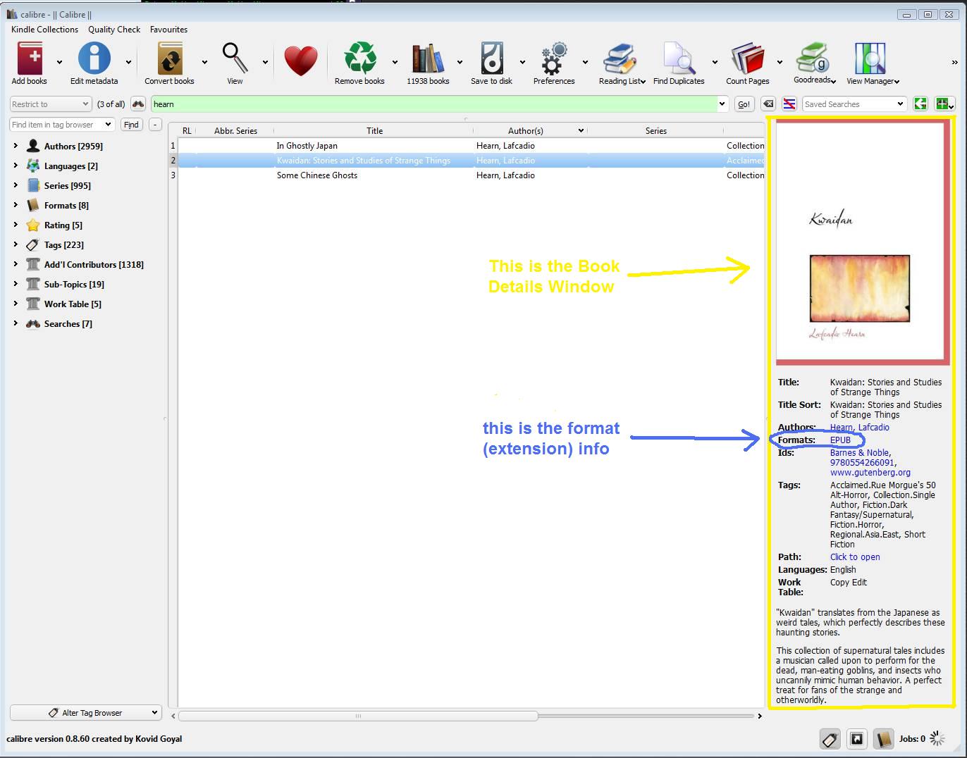 When you highlight a book, the right side panel (look at the pic below), you'll see FORMATS. That's the file extension you are trying to look for. There's PDF and EPUB. If you want to know where that book is, just click PATH: Click to Open. ![]() Can you be more specific on what you mean by filename? Because when you load a book in Calibre, sometimes the Title and Author field is messed up like the in the pic below. It happens when the file you load is in PDF, HTML, or RTF. ![]() When you change the Title and the Author name, the FILENAME of that book will change too into TITLE - AUTHOR. |