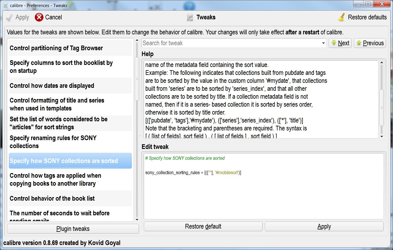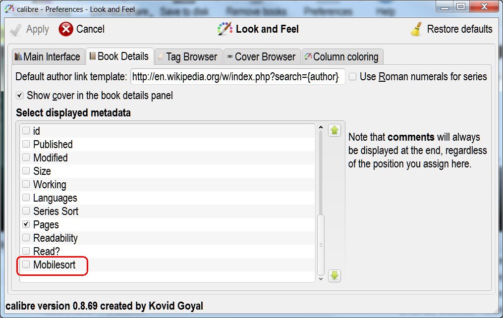 • Further cleanup by removing mobilesort from the Book details window. Go to Preferences - Look and Feel - Book details tab and uncheck mobilesort. (see attachment 6)