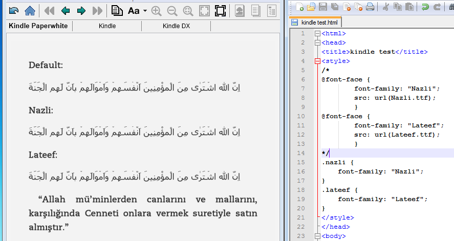 It is also interesting that your prewiever's default font and my prewiever's default font are not the same in terms of showing alaf with fethah. Besides, Kindle Previewer in my XP machine and win7 machine show fethah and kesrah with different slopes. One shows horizontal and one shows inclined.... Because of inconsistencies, I gave up embedding Arabic font. However, it is still boring that not all kindles will show vowel signs even with its default font. It seems it is better to convert text to image or preshape the text. Last edited by sevenkul; 03-08-2013 at 09:28 AM. Reason: added attachments |
