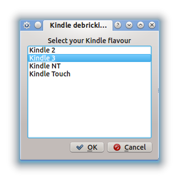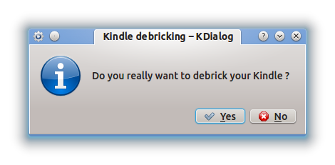 kdialog --title "Kindle debricking" --yesno "Do you really want to debrick your Kindle ?" 5 50 dialog --title "Kindle debricking" --yesno "Do you really want to debrick your Kindle ?" 5 50 kdialog --title "Kindle debricking" --radiolist "Select your Kindle flavour" "2" "Kindle 2" 2 "3" "Kindle 3" 3 "4" "Kindle NT" 4 "5" "Kindle Touch" 5 dialog --title "Kindle debricking" --radiolist "Select your Kindle flavour" 12 50 7 "2" "Kindle 2" 2 "3" "Kindle 3" 3 "4" "Kindle NT" 4 "5" "Kindle Touch" 5 |