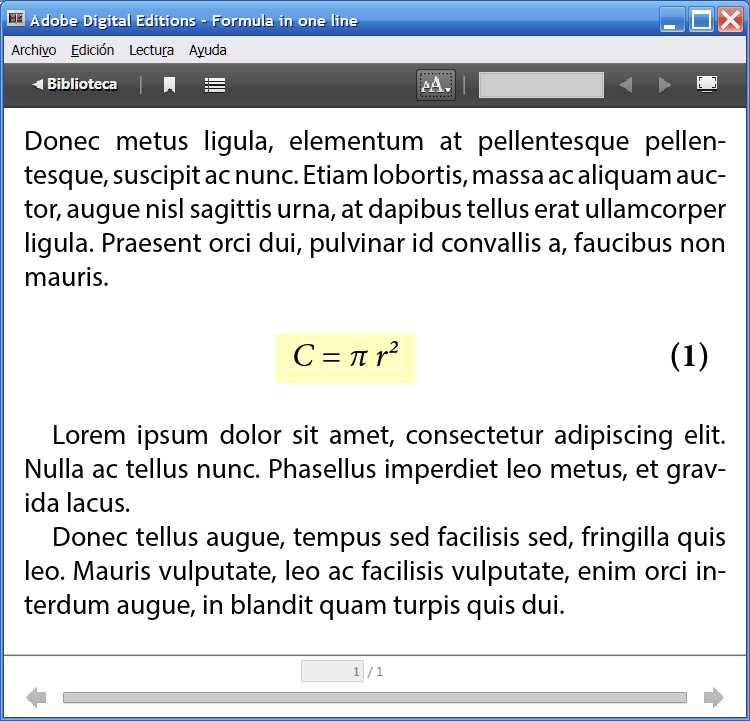 <p>...Some text here ... </p> <p class="container"><span class="number">(1)</span><span class="formula">C = π r²</span></p> <p>...Some text here ... </p> ![]() VERY IMPORTANT: The class "number" MUST BE FIRST than class "formula". That is the key in order that the number and the formula are in a same line. Below you can see a screenshot of my ADE and the respective epub. Regards Rubén |