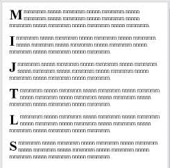 The main difference between your solution and mine is that while you use the property "width", I use the property "margin-right" (also I use a negative "margin-top"). Why am I using the property "margin" instead of "width"? Because -with the property "width"- the gap between the dropcap and the sorrounding text varies according with the dropcap letter. Is not the same if the letter is "I" or "E" or "M" o "W". By using the property margin-right (in pixels) that issue is not present. The following pictures shows better what I want to say. The first picture use your solution and the second picture, my solution. I know that "technically", with the property "float" the normal is to assign a "width" and you are proceeding according the rules. But with the .kf8 format it seems that with "dropcaps" is better not to assign a width. Best regards Rubén |