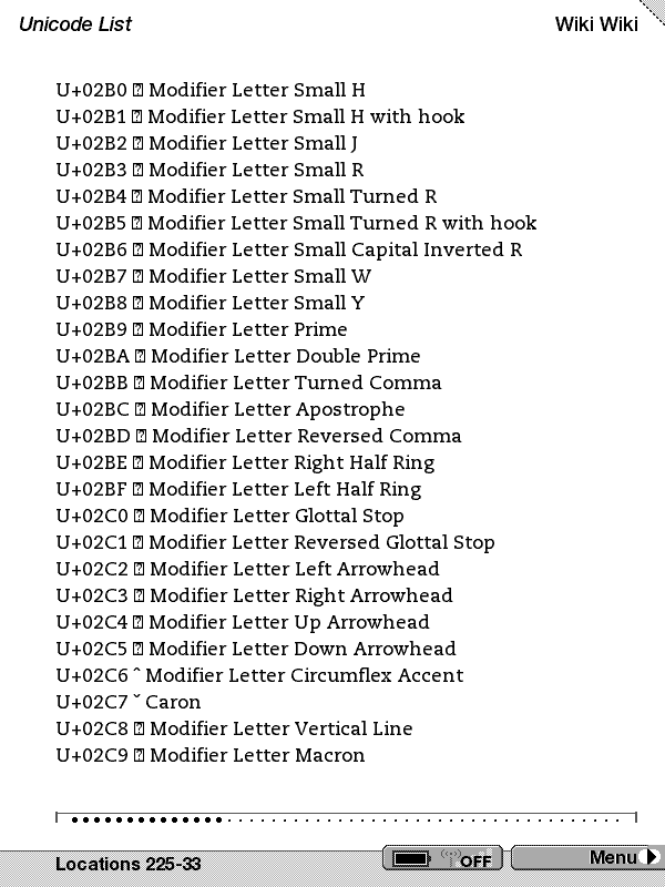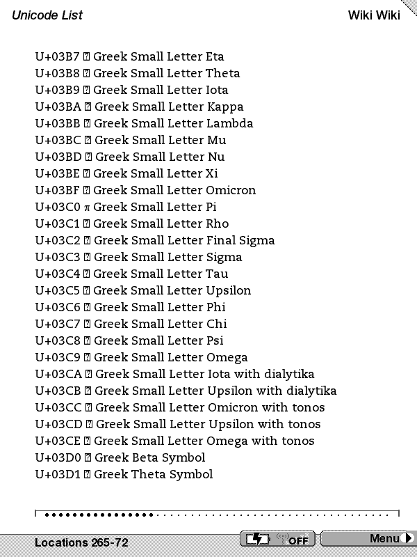 Note that the really interesting glyphs from a eBook perspective are in the range of 200C hex to 2044 but your original sample did not include these. On my decimal page these are the ones from 8204-8260. They have things like curley quotes, emdashes, etc. You might want to try those ranges and see what you get. Dale |