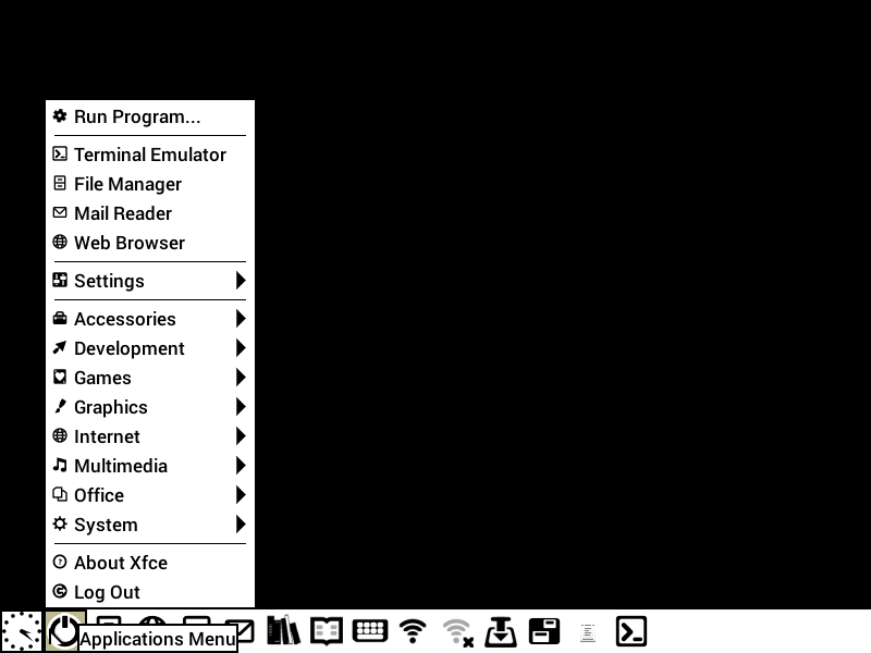 to get, a small thing to work like a bigger thing. Here are some pics of my kobo-mini as it now works with debian (version is latest "testing") OS [screenshots are taken by the kobo-mini] === My daughter commented that, "all these black screens look like the monolith in the movie "2001", black tombstone trans-ceivers talking to, who knows who, what or where ... - Hence the choice of image for - startup/power_off === - 16Gb partitioned w/space for 2nd (future *nix OS) - boot to "kobo or debian" screen in < 5 sec - boot debian OS in < 10 sec - web browser boot < 5 sec - high contrast theme/icons - optimized fonts for EInk screen - (most) color info removed for high contrast text - xfce desktop - ad blocking via auto update/hosts file - synaptic package manager - custom useragent for mobile sites - news feed reader, email, ebook reader ... etc - Panel: . clock . system menu . internet browser . news/rss reader . ebook reader . file manager . editor . virtual keyboard . wifi ON/OFF . terminal . status cpu/ram/swap . windows active & a working torrent downloader ![]() * Tip: - opening the terminal (with it's background set to white) - then minimizing windows (with desktop background black) refreshes the screen. Later 2bits Last edited by 2bits; 10-03-2013 at 06:44 PM. Reason: pics didn't attach ? |
