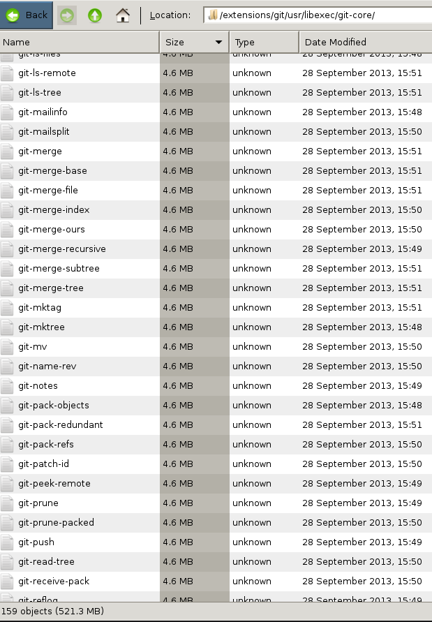 well you can just copy the file /extensions/git/usr/libexec/git-core/git and call it git-merge. (screenie attached - you can see they are all the same file) disappointing that git uses some of those names internally, the implication was in the support threads that git merely used the location as an old, additional support backup... (I link to the msysgit project as the FAT storage effectively puts in the world of windows) perhaps I could go with an ext3 loop as was my original vision... I personally think I would fix this on my own machine with an "alias" but a hard copy would have just the same effect. rsync.. pretty certain I already did that. will nose around and ctorrent... and here is the monster sized GIT, should you fancy taming the beast yourself. https://dl.dropboxusercontent.com/u/...DUMMY.-hugezip Last edited by twobob; 09-29-2013 at 08:23 AM. |