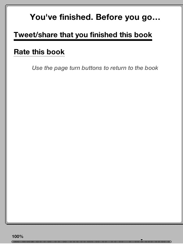 Actually, I finished another book last night and DIDN'T get the popup. Which leads me to believe that maybe it does work but only for titles that have never previously "made it to the end", so I will look to implement a blend of both Ixtab's and eschwartz's work at some point RSN. |