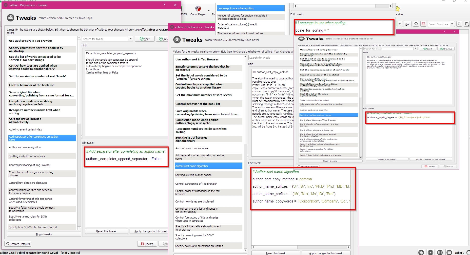 I need to rule out that there are "invisible" complex (unicode) characters in those problem author names that we cannot "see", but are there nevertheless and are causing the ABCH plug-in to misinterpret them. I have a huge number of English and Spanish EPUBs, but I could not find a single ABCH that was not correct. So, I need your help. Could you do the following? [1] Select all of a single problem author's books. [2] Using Bulk Edit Metadata, manually change the author from what it is to what it is, but manually keying the author's name again. Do not copy and paste. Key it in freshly so we know it is a valid author name. Save the changes. [3] Restart Calibre. [4] Run the ABCH job. Look at that problem author's books and see if ABCH was "fixed" (or not). Let me know. Thanks. DaltonST |