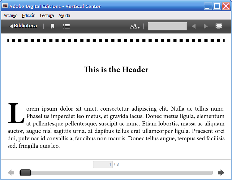 1. A method based on the property "padding". 2. A method based on the properties "display: table" and "display: table-cell". 3. A method based on the property "line-height" (the easy method if you want to center only one line). Here you can see a screenshot of the result under ADE: Below you can watch the respective epub. Regards Rubén Last edited by RbnJrg; 08-17-2014 at 02:33 PM. |