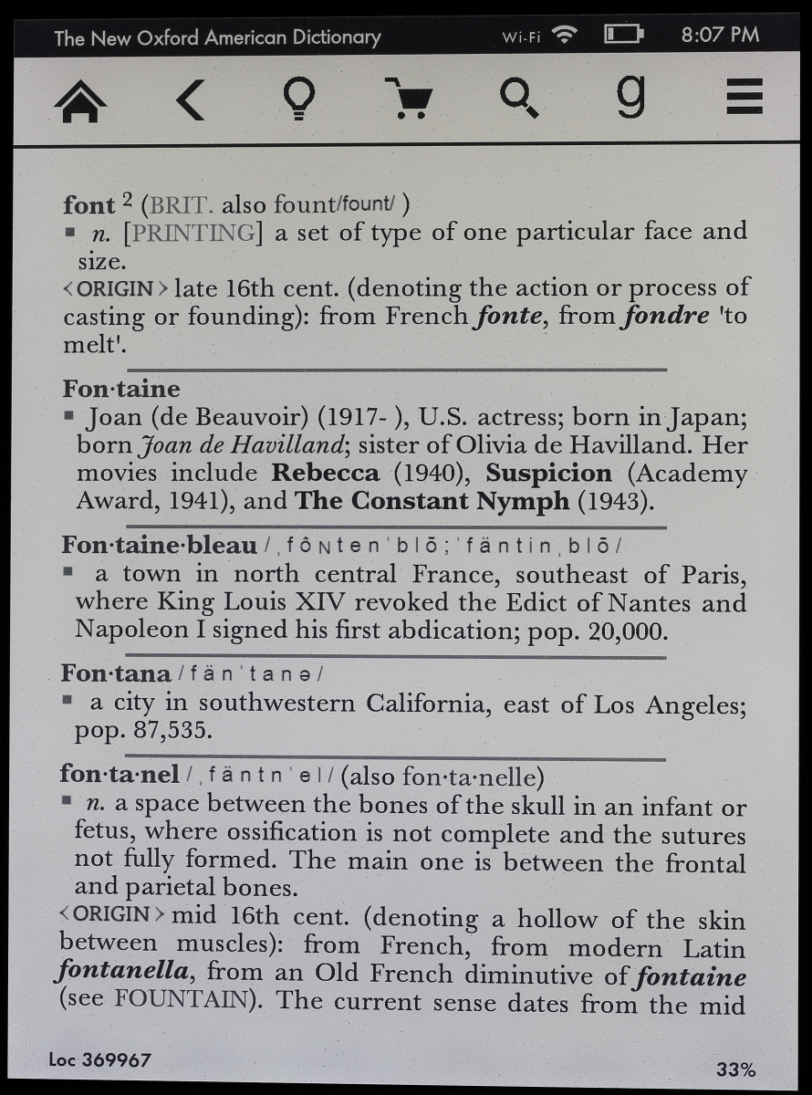 Thank you for the great pictures. Could be some weeks till the Voyage hits the shelves of the retail shops in Germany. So I'm happy to get previews mostly to see how much of an impact the 300 dpi resolution has. Sadly all seem to use the Caecilia font. The benefit of higher resolution should be more visible with "true" serif fonts like Baskerville or Palantino though. Could you do some pictures with Baskerville (font size 3/4) perhaps with a page of a Dictionary (the American one has a good mix of font styles)? Thanks in advance. |