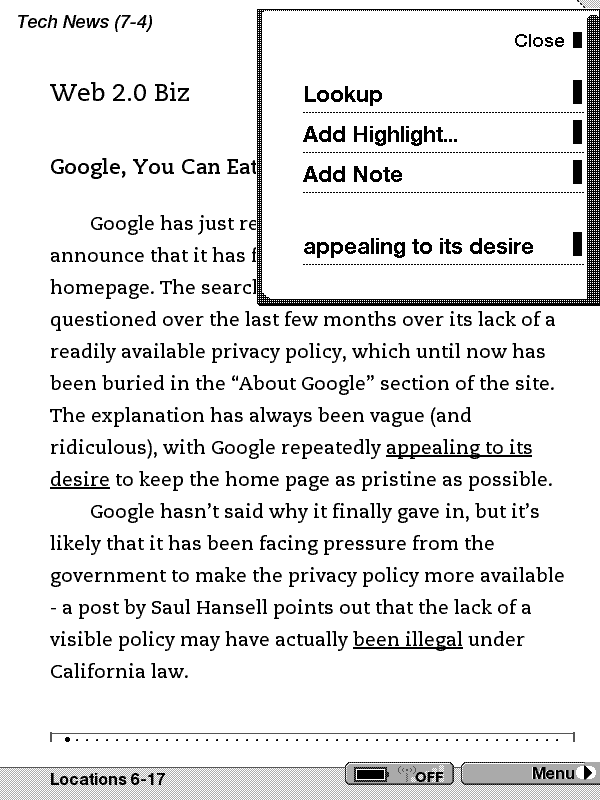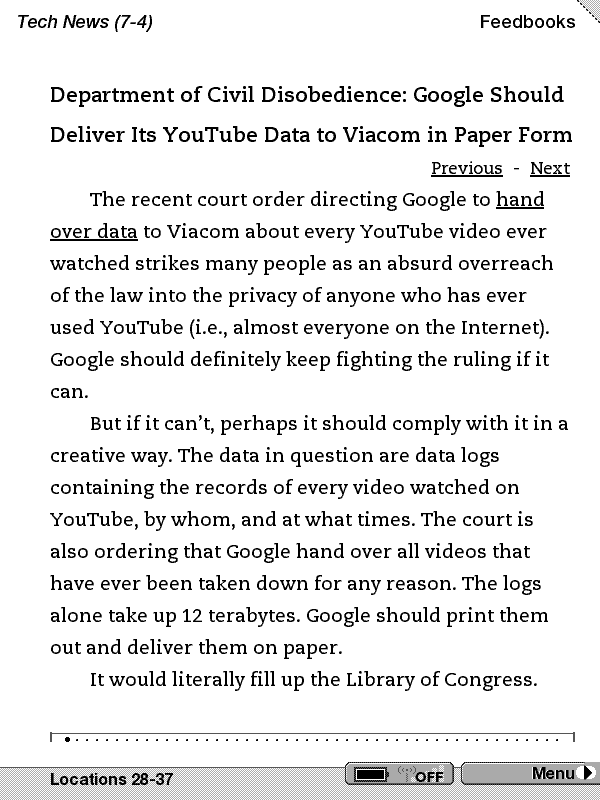One of the most interesting things to try once this feature is online will be to read a blook (blog+book), which is basically a serialized novel published on a blog. For the last 2 years, Lulu even created a Blooker Prize to award the best blooks. I'm not a huge fan of LCD screens for reading, but with an e-paper device on my hands, things are much different and I'll probably start reading a few blooks and hope that I'll find one that suits me pretty well. I even found a directory listing some of these blooks: http://www.pagesunbound.com/ As a proof of concept, I've generated a Mobipocket file out of one of the blook listed on Pages Unbound, and embedded the file with this post. For an optimal result, those blooks should probably offer a feed in both normal and reverse order, and make sure that all of the parts are listed in the feed. |