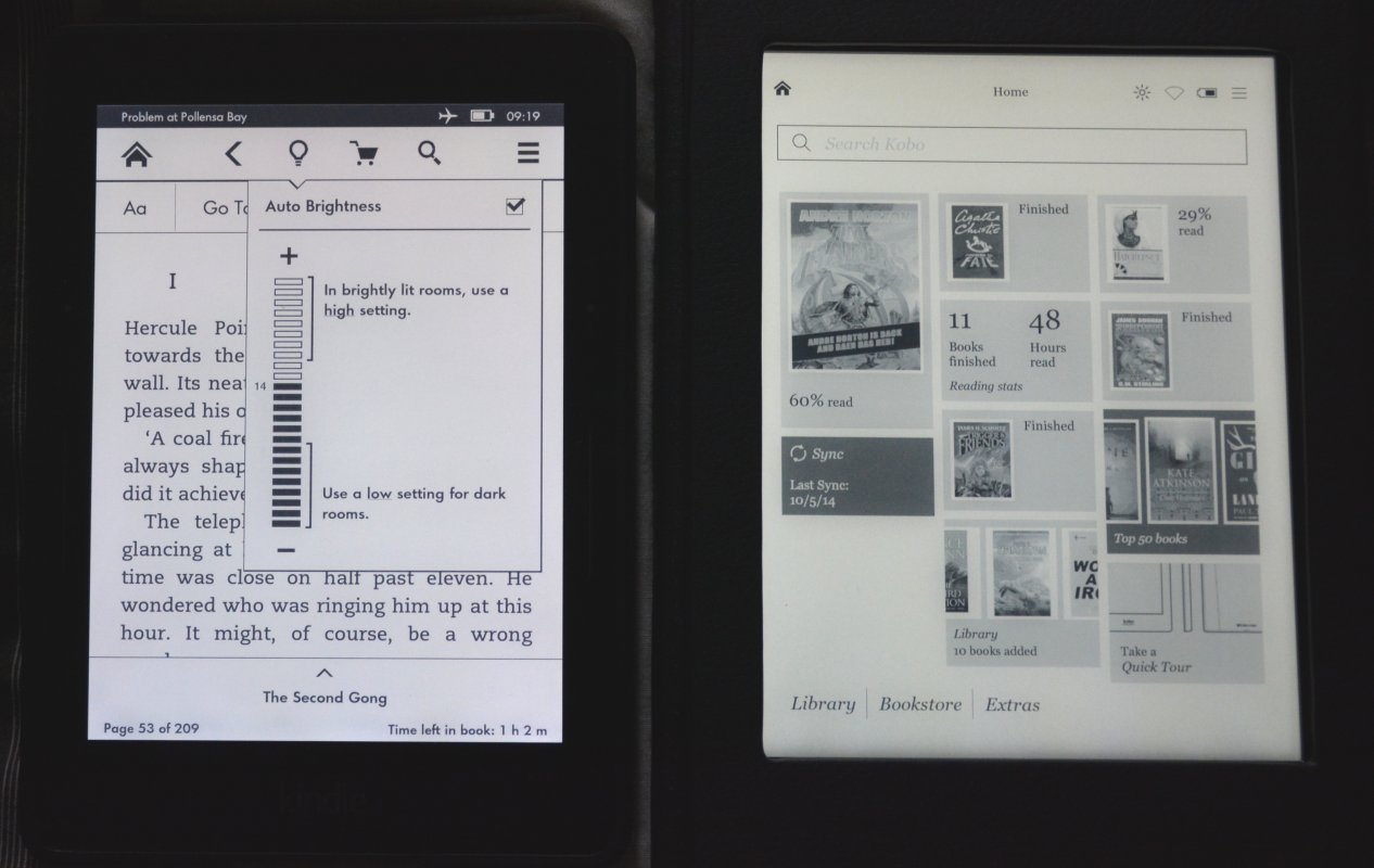 Here's a photograph I've just taken of my Voyage (left) and Kobo (right) side-by-side. Can you tell me how much of a colour gradient you can see in each screen, please? I adjusted the brightness so the two screens appeared of equal brightness to me. |