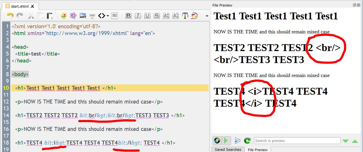 <h1>Test1 Test1 Test1 Test1 Test1 </h1> <p>NOW IS THE TIME and this should remain mixed case</p> <h1>TEST2 TEST2 TEST2 <br/><br/>TEST3 TEST3 </h1> <p>NOW IS THE TIME and this should remain mixed case</p> <h1>TEST4 <i>TEST4 TEST4 TEST4</i> TEST4 </h1> 2. I don't understand why the same logic isn't applied to the second and third so that all text between the Hx's is made title case, as well as why the replacement of < and > with entities which end up being treated like normal text |