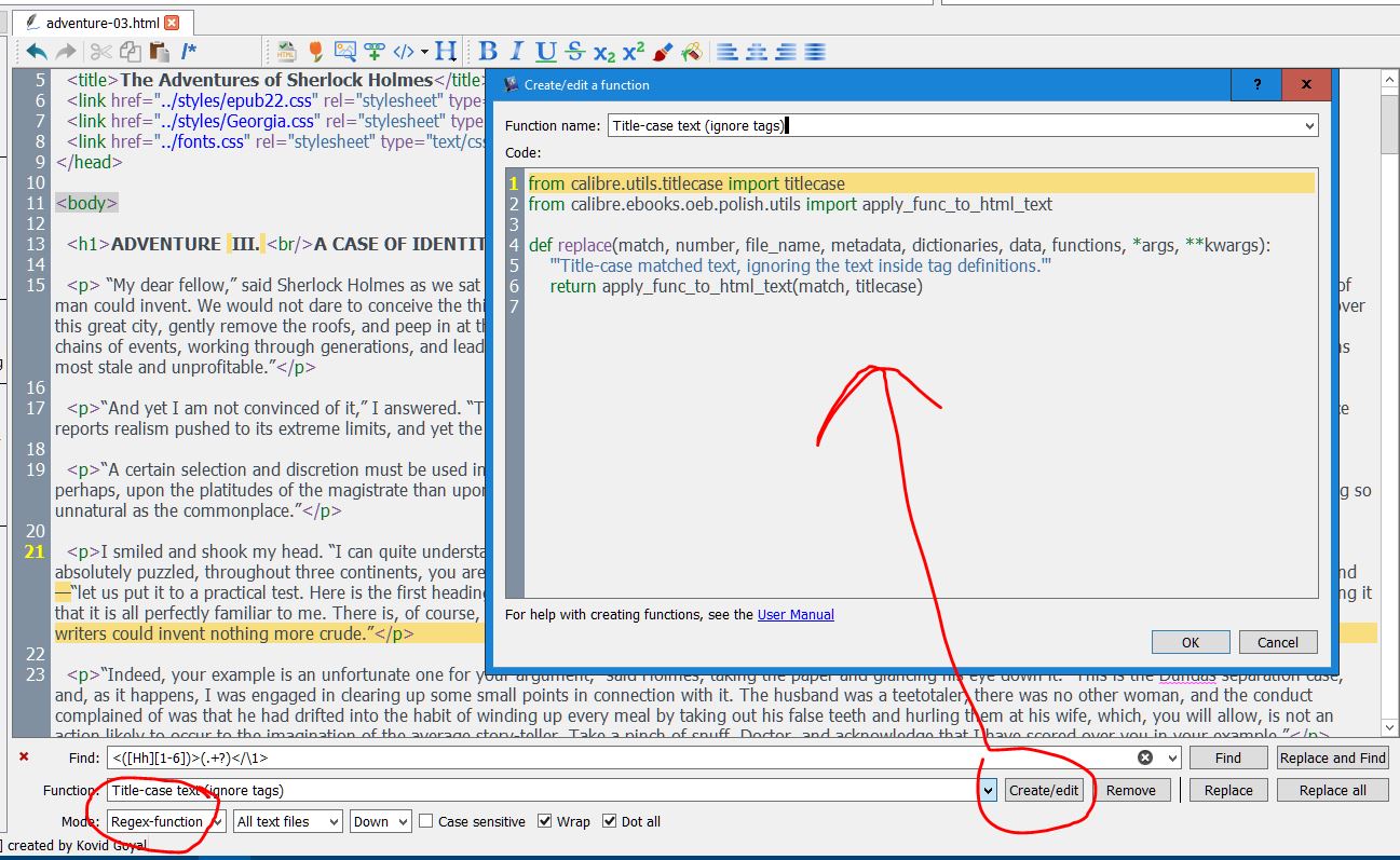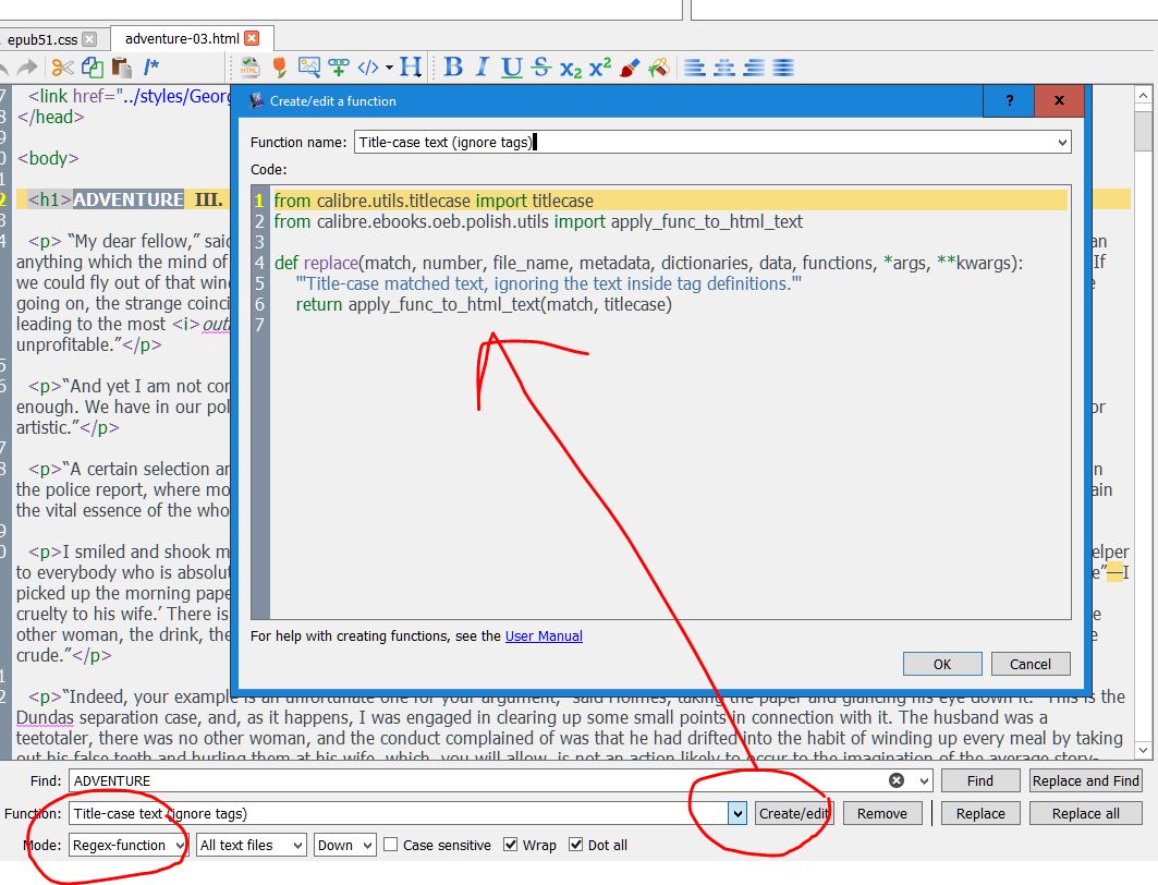 I was confused by the apparent different treatment of the TitleCase function between the first (simplest) sentence "Where It Worked Just Fine" and the second and third where IT LEFT EVERYTHING IN UPPER CASE @jbacelar -- The Find Kovid gave me seems to work fine. It would select all this H1 text, including the <h1> and </h1> ... <h1>TEST2 TEST2 TEST2 <br/><br/>TEST3 TEST3 </h1> After the Replace <h1>TEST2 TEST2 TEST2 <br/><br/>TEST3 TEST3 </h1> What was confusing me was that the text was not in title case. I understand the replaced entities now I believe that Kovid's new built-in function is the only way to handle these types of cases |