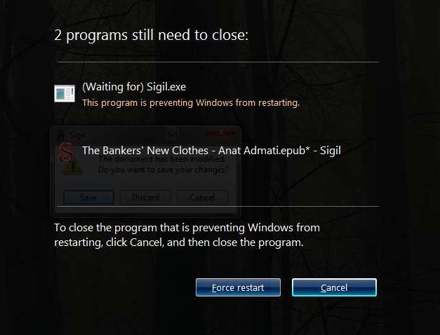 I can confirm that if Sigil is not closed gracefully in Windows then the copy of the file under edit (as originally read) remains in ...\Temp\sigil\scratchpad - it's unpacked so it would need to be zipped with epub extension. If I restart Windows and Sigil has an unsaved file, I get Sigil's normal "File hasn't been saved - Save, Discard, Cancel" popup message, and if I ignore that I get the following after ~10 seconds I think that waits forever for a response. But I'm not sure if the above is true if Windows Update initiates the Restart automatically, the way I have it configured that can't happen and I'm not minded to change it for testing. So I suggest there's nothing to do... unless if'n you wanted to implement some sort of recovery scheme via automatic periodic saves BR |