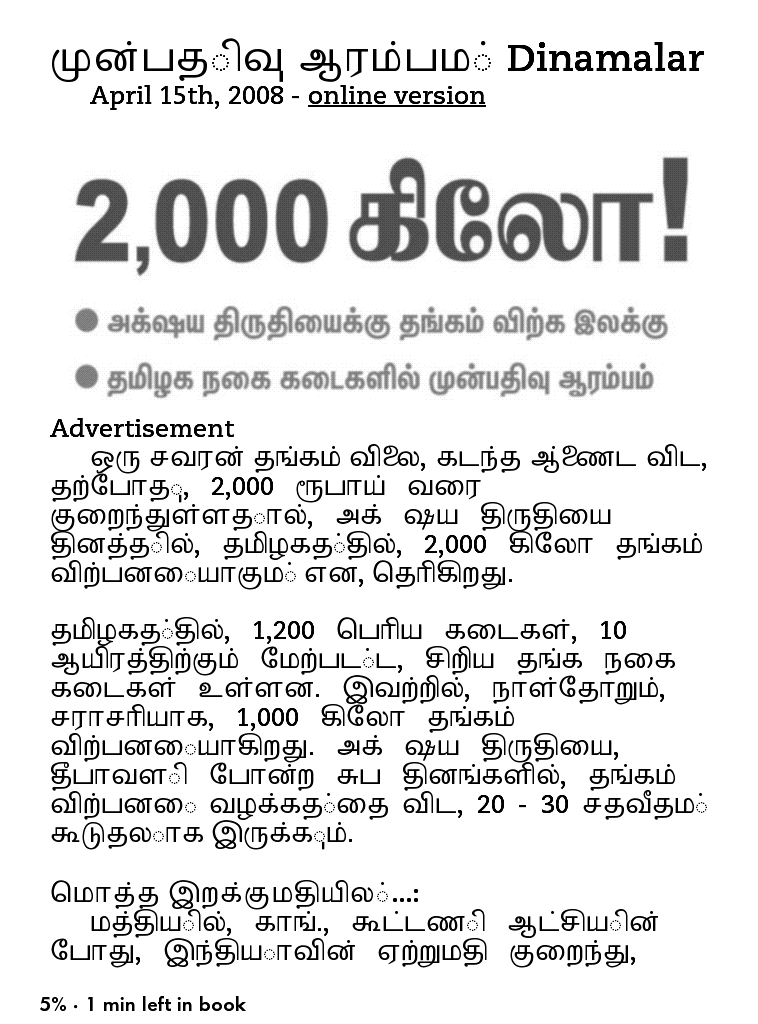Since very few MR members read Tamil, you'll have to be more specific regarding the problems that you're facing.  If you're trying to convert a .pdf file to an .azw3 file with Calibre you shouldn't expect perfect results, because even utf-8 encoded Latin alphabet based .pdf files rarely convert well. This particular .pdf also won't convert well at all, because it's not encoded in utf-8 but TSCII. You may want to search for the original TSCII etext, convert it with an TSCII to Unicode converter and then convert the Unicode text file to an AZW3 file. If that's all too complicated for you, try to resize the original file for 6" screens with k2pdfopt. |