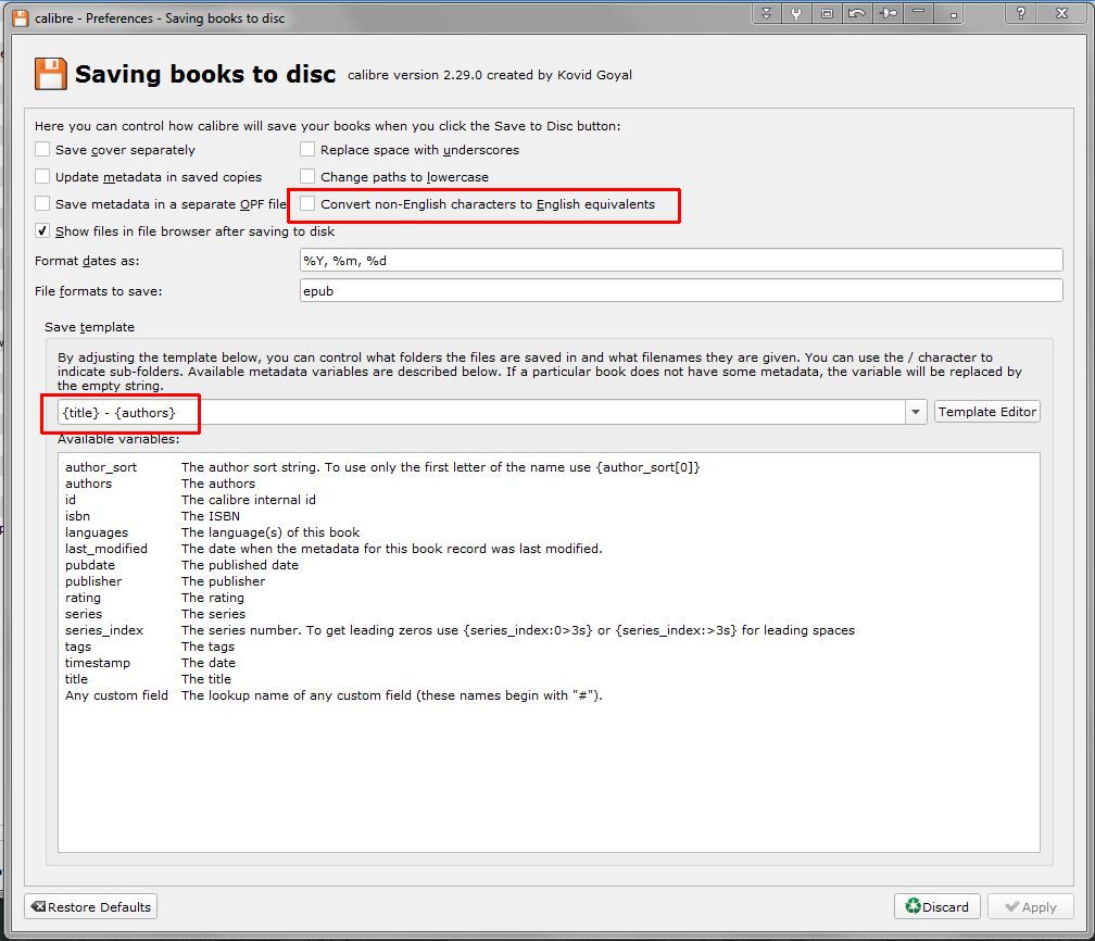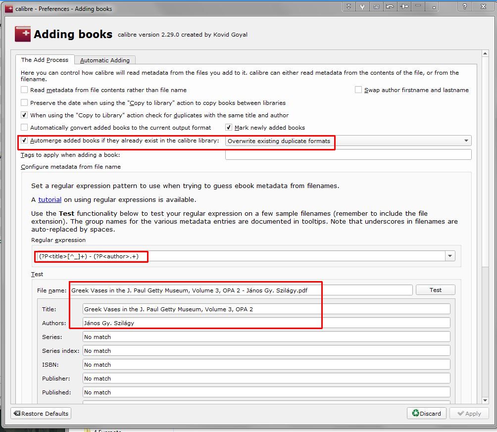 Actual book title:Greek Vases in the J. Paul Getty Museum, Volume 3, OPA 2 auth:János Gy. Szilágy saved pdf: "Greek_Vases_in_the_J._Paul_Getty_Museum,_Volume_3 ,_OPA_2-@-Janos_Gy._Szilagy.pdf" converted djvu: "Greek_Vases_in_the_J._Paul_Getty_Museum,_Volume_3 ,_OPA_2-@-Janos_Gy._Szilagy.djvu" save format: "{title}-@-{authors}" add books regex: "(?P<title>.+)-@-(?P<author>[^_]+)" This is tested properly with the regex in the add books window meaning that all the underscores are repalced with spaces properly and the author is recognized properly. I wonder if the new template which replaces spaces with underscores is the issue? |