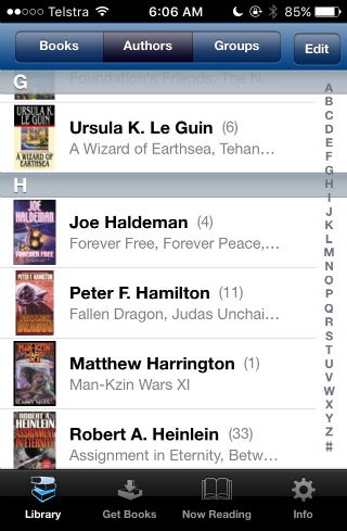 An index scroller that doesn't file books under author names is awful for me. Particularly with prolific authors where I might have 20-30+ books, having to browse through titles is deeply irritating. I have 300 books in my Kindle library and an index scroller doesn't work at at all for me there. The total library is far larger.