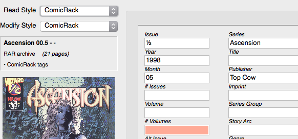 I did run into one issue that you might want to check - when the issue number is 1/2 it errors with "could not convert to string". I would prefer that if it encounters a "1/2" it converts it to .5 on import so the series number would work well with Calibre. I try to catch these during tagging but I missed a couple and then ran into this error. Nice, nice work. Do you have any donation avenues set up as I know time is VERY valuable? |