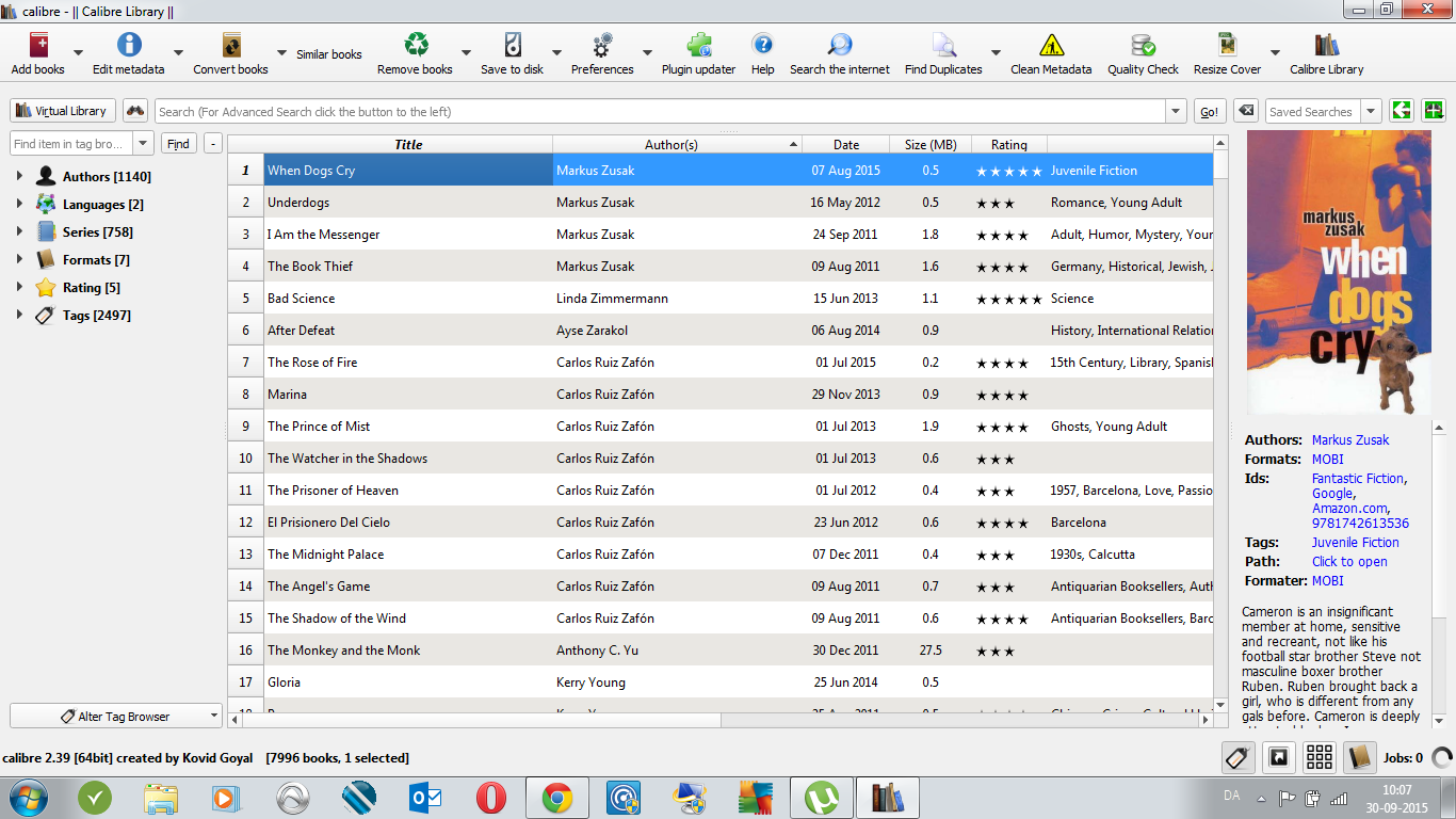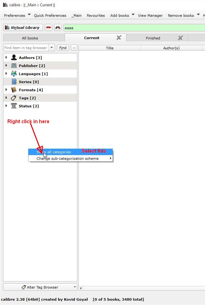 Tried to solve problem by uninstall then install calibre, open a new library, then move the bookfolders from old library, deleting the 2 databases, then ask for restore of database from data in folders. Now I get the tagbrowser-panel - but the new db seems to be curupt: calibre, version 2.39.0 ERROR: Startup error: There was an error during calibre startup. Parts of calibre may not function. Click Show details to learn more. Traceback (most recent call last): File "site-packages\calibre\gui2\main.py", line 273, in initialize_db_stage2 File "site-packages\calibre\gui2\main.py", line 213, in start_gui File "site-packages\calibre\gui2\ui.py", line 414, in initialize File "site-packages\calibre\gui2\init.py", line 601, in save_layout_state File "site-packages\calibre\gui2\library\views.py", line 530, in save_state File "site-packages\calibre\gui2\library\views.py", line 524, in write_state File "site-packages\calibre\db\cache.py", line 57, in call_func_with_lock File "site-packages\calibre\db\cache.py", line 587, in set_pref File "site-packages\calibre\db\backend.py", line 126, in set File "site-packages\calibre\db\backend.py", line 122, in __setitem__ File "site-packages\calibre\db\backend.py", line 806, in execute File "c:\cygwin64\home\kovid\sw\build\apsw-3.8.2-r1\src\cursor.c", line 231, in resetcursor CantOpenError: CantOpenError: unable to open database file |