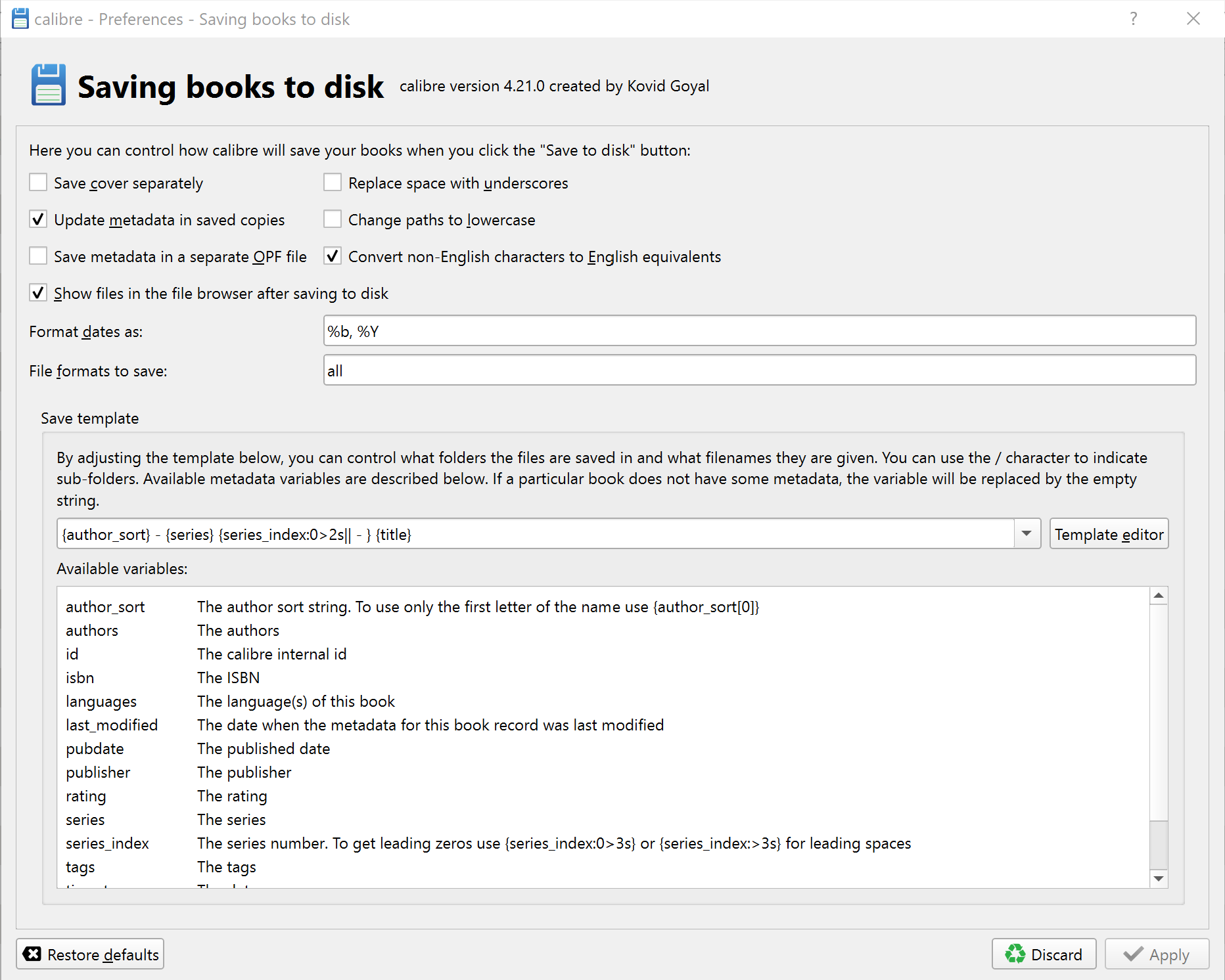 I don't care for the file system that Calibre uses either. But, Calibre needed a consistent method that the program (not a thinking person) could use to know where everything is. It can't change now even IF they wanted to - it would screw up all the years of programming/plugins that went in to it. However, there is a very easy, built-in to Calibre, option to solve this which I use regularly. It is called "Save to Disk". After you add all your metadata, covers, etc. to Calibre, just click on the "Preferences" button and then select "Saving Books to Disk" (see attachment). You can set Calibre to save your ebook with all the updated metadata, covers, etc. to the location of your choice, with the filename template of your choice. Once you have your preferences saved, just highlight the books you want to save and hit the "Save to Disk" icon to make a separate copy of your library to use as you see fit! It's really quite nice. I have my filename template set to: {author_sort} - {series} {series_index:0>2s|| - } {title} which gives me something like: Eddings, David - Belgariad 01 - Pawn of Prophecy.epub Last edited by Turtle91; 08-24-2020 at 06:54 PM. |