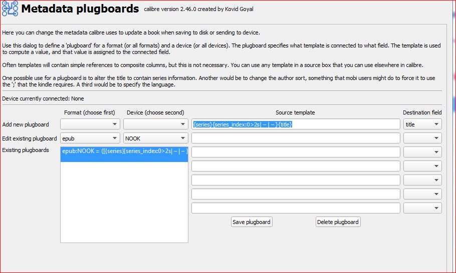 In Metadata plugboards I used all the same info as in the opening post but just changed device from Nook to Kobo. No success. Then tried KoboTouch. No success. But when I tried 'any device' it worked. |
