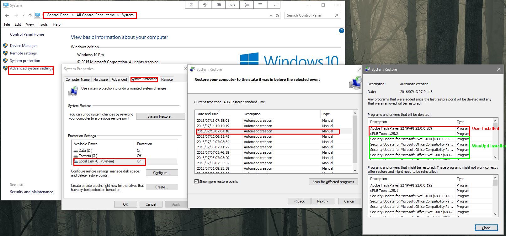 1. Security Update for Microsoft Office Compatibility Pack Service Pack 3 (KB3115309) 2. Security Update for Microsoft Office Word 2007 (KB3115311) 3. Update for Windows 10 Version 1511 for x64-based Systems (KB3173428) 4. Security Update for Microsoft Office Excel 2007 (KB3115306) 5. Cumulative Update for Windows 10 Version 1511 for x64-based Systems (KB3172985) 6. Security Update for Microsoft Office Compatibility Pack Service Pack 3 (KB3115308) 7. Windows Malicious Software Removal Tool for Windows 8, 8.1, 10 and Windows Server 2012, 2012 R2 x64 Edition - July 2016 (KB890830) 8. Security Update for Adobe Flash Player for Windows 10 Version 1511 for x64-based Systems (KB3174060) Mainwhile I'll try your sugg. Txs |