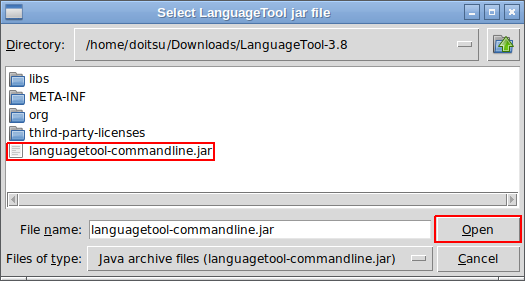 For example, if you unzip LanguageTool-3.8.zip in the Downloads folder, languagetool-commandline.jar should be located in: /home/gregory/Downloads/LanguageTool-3.8/languagetool-commandline.jar (I wouldn't recommend using the Downloads folder, though. I'm just using it as an example.) When you run the plugin for the first time, you'll need to change the default folder in the file selection dialog box to the folder that you extracted language tool to. To change the folder either click the button right of the current directory and/or click the up arrow button to display the parent folder. Once you've selected the correct folder you should see several subfolders and languagetool-commandline.jar. Click languagetool-commandline.jar and Open. Last edited by Doitsu; 09-12-2017 at 02:58 AM. |