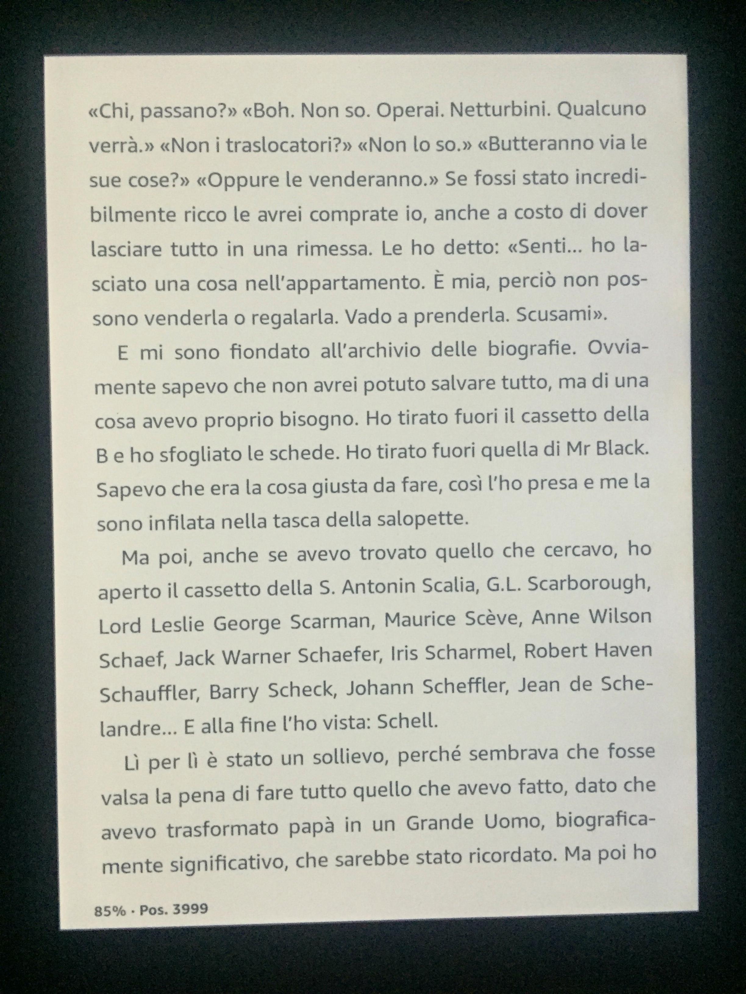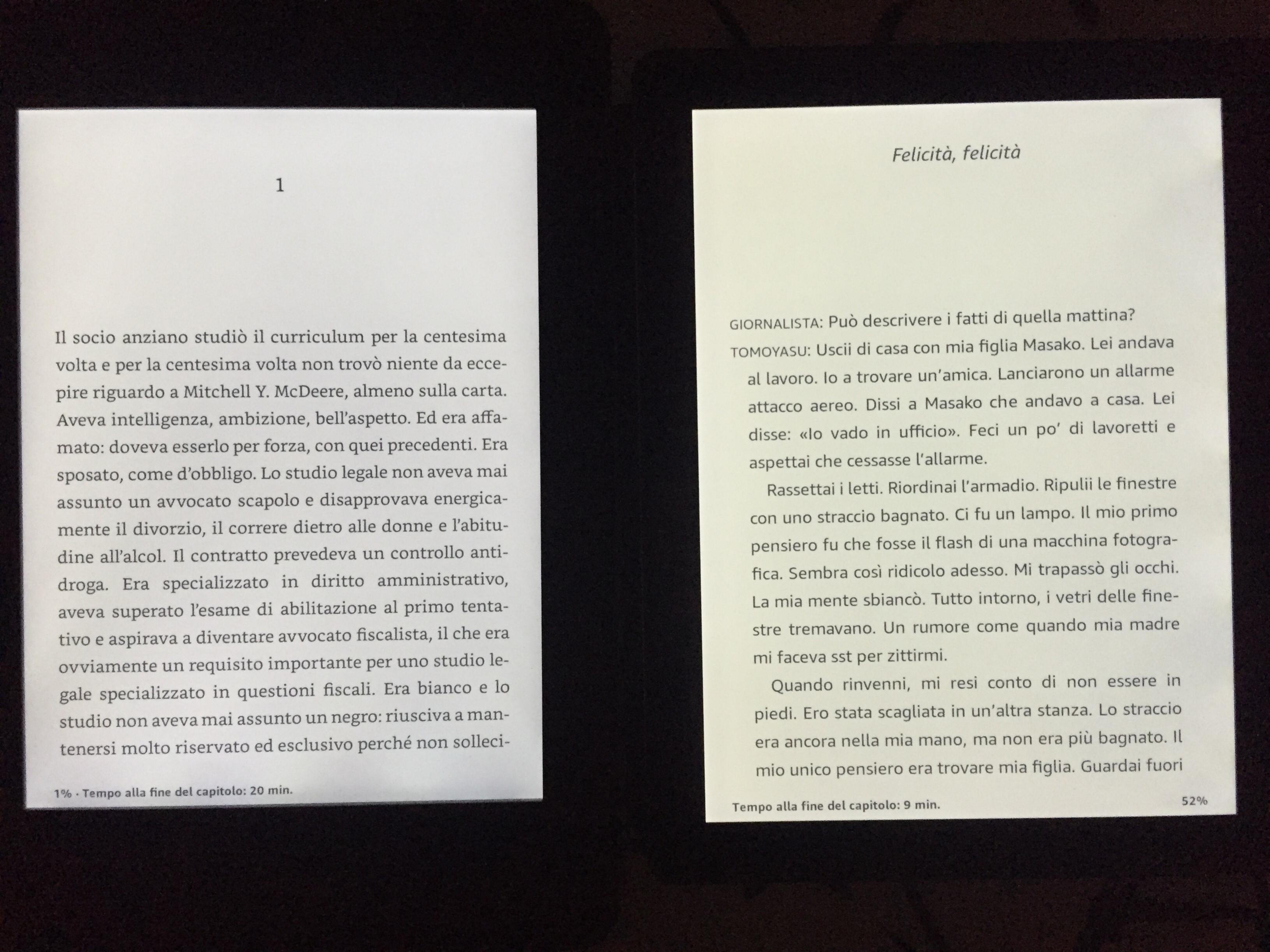I'm going to post a couple of photos of my current Oasis (still waiting for the new one), both are taken by night (when the colour shifts are glaring), and one is a side by side confrontation with my paper white 3. I love the fact that whit the Kindle I can read without a lamp and, way more important, I don't bother my wife while she's asleep. That's why I'm trying to get a unit whitout the colour shifts problem (besides the fact that I'm spending a lot of money and it is my right to pretend a perfect product). Now I just have to wait the delivery and hope to get a unit with a better screen. I love my Paperwhite, but the Oasis - in my opinion, of course - takes the reading to another level. I love the ergonomics and those physical buttons are a game changer to me (I was waiting for them to come back since the last Kindle before the Touch and the first generation Paperwhite). Overall I would be sad to give back the Oasis but it could be the only choice. |