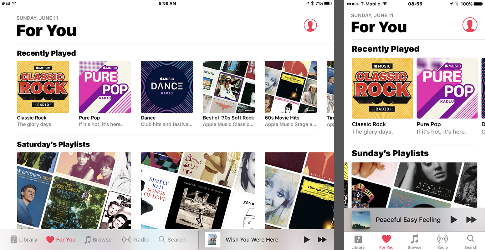 Here are some side by side comparisons of the Apple Music app with the iPad app on the left and the iPhone app on the right. (See the attachments.)