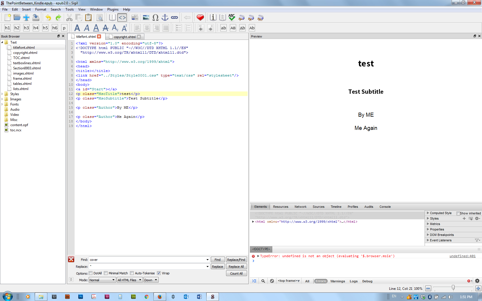 BTW, I tried it out. But now I have a new question: In the lower right-hand corner an error displays. (See SS.) It appears to be somehow related to my browser? The file is otherwise fine (ie., passes validation). What might it be? I haven't figured out how to get Sigil to tell me where the error is. And the error disappears when I hide/unhide the console. It then reappears if I close down Preview and reopen it. Another mystery. |