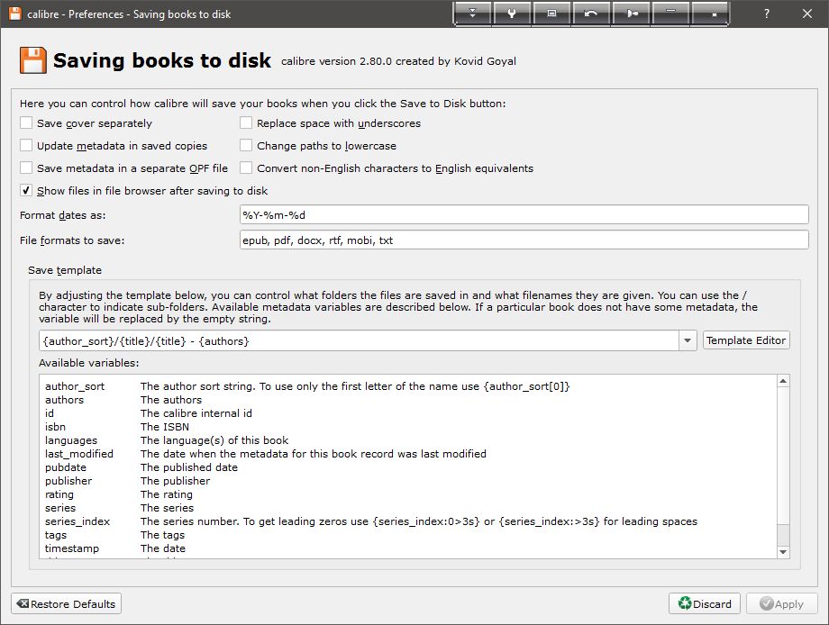 I'm using Windows 10 version 1706 (up to date as of 30 minutes ago), and Calibre 2.80. This computer had it's 10th birthday last November. My tests were of: Save to Disk->Save to disk in a single directory on a book that only has an epub, and my STD settings are thus: In that environment I can't reproduce what you've described. Calibre always saves the current EPUB (or other formats). If the file already exists it is always overwritten and the mod and create timestamps are always the date and time of the STD operation - even if I don't change the EPUB. The overwrite happens irrespective of the create and mod timestamps of the existing file. I tried backdating to the 19th and forward dating to the 22nd centuries. I tried make the existing file Read Only and I got this error. Code: