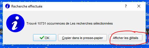 The new feature (Show details) works beautifully, now both for "Count all" and "Replace all". Thanks again, it's a real pleasure to use. I still have a small question. If I understand, everybody will understand. Say, I have a group of some saved searches I wish to use. Their common given name includes the word "insé". So, on the search line of the saved searches window, I type this filter name "insé" to call them and, bam!, I instantly see all of them displayed. If I do a right click on the filter line, I see a menu entry named "select all". However, if I try to use it, it does not select the displayed saved searches (which I expected it to do) but only select the search word "insé". Question: could we have the possibility to select all the called for saved searches? |
