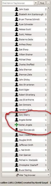 In an effort to help reconcile the differences between what the OP and Kovid say they are seeing, I added some pictorial evidence of what I see when I change an Author name in the Tag Browser. And to point out that if one peruses the Manage <whatever> list looking for apparent anomalies, as someone suggested, there is no easy way to see which books are categorised by a given value. Using a server task to browse the same library is hardly 'easy', especially if it's not already running. When I was setting up my library, I identified anomalies by perusing <category> CSVs that I obtained from the database, I corrected them in the book list via F2 cell editing. BR |