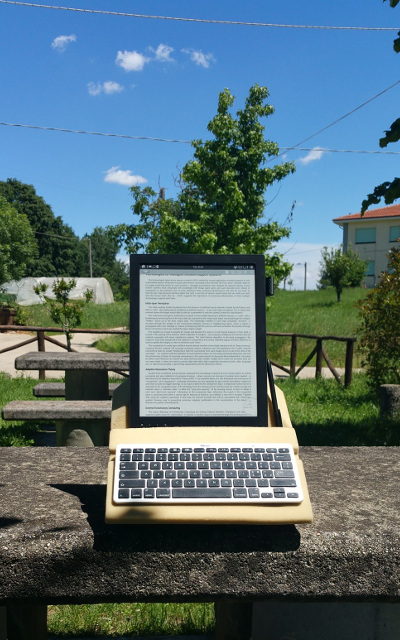 I really recommend the Microsoft Wedge BT keyboard for the very simple reason that its lid makes a perfect stand for the Onyx Max Carta. Even for portrait mode as in the illustrations above. It is a very lightweight combination to bring to the park or outdoor Café.