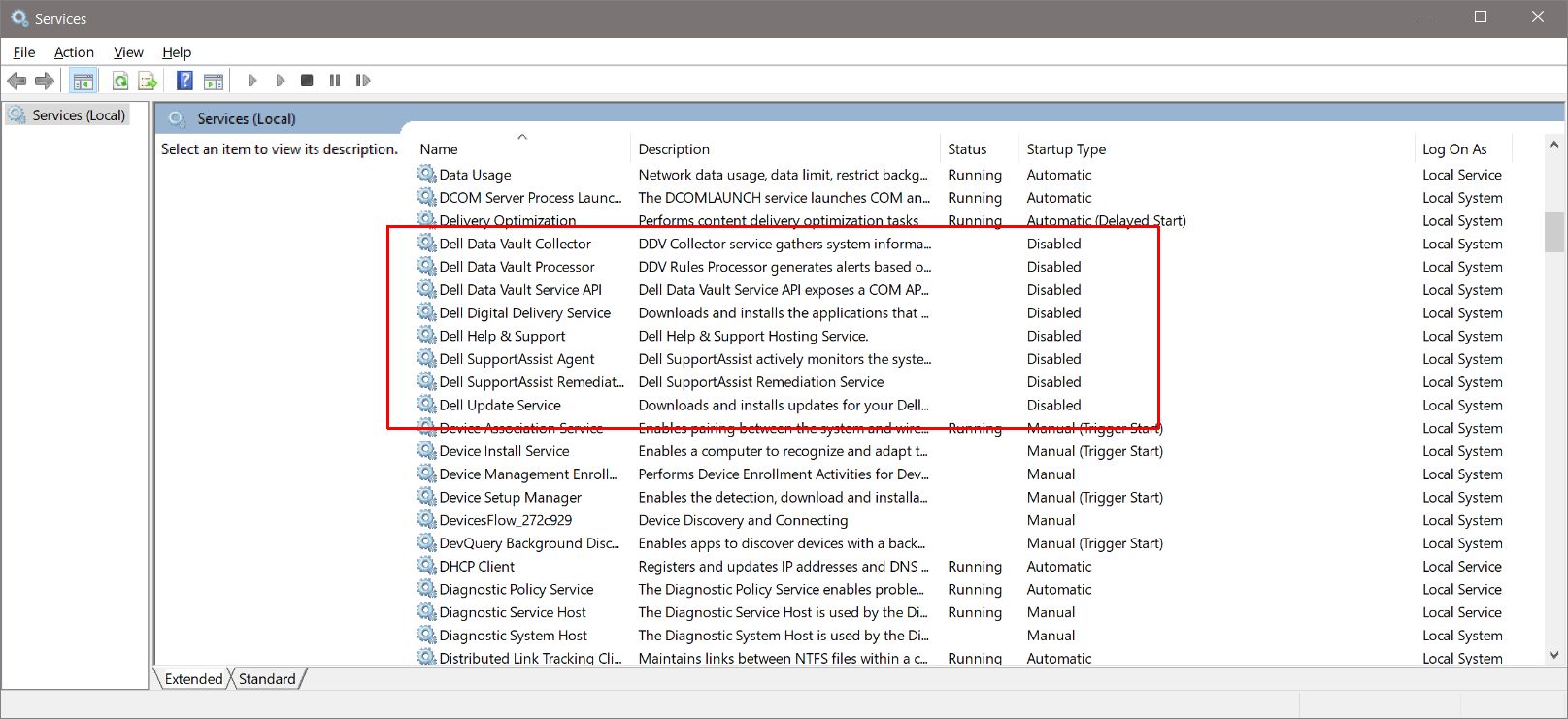 I've also just seen that CCleaner can also disable shell extensions (I think that must have been added since I last looked), so there's no need for the nirsoft utility, other than to get a second opinion. Manufacturers also run bloat as scheduled tasks, CCleaner can enable/disable them too. Dell installs some of its bloat in services, you'll need to find them via services.msc module, you can disable them in Properties (one at a time). Other manufacturers probably do the same, here's an example of Dell services I have disabled. If you're apprehensive in doing changes to Windows, create system restore point at appropriate times. WinKey+S then 'restore point' will get you to the right place to do that. BR |