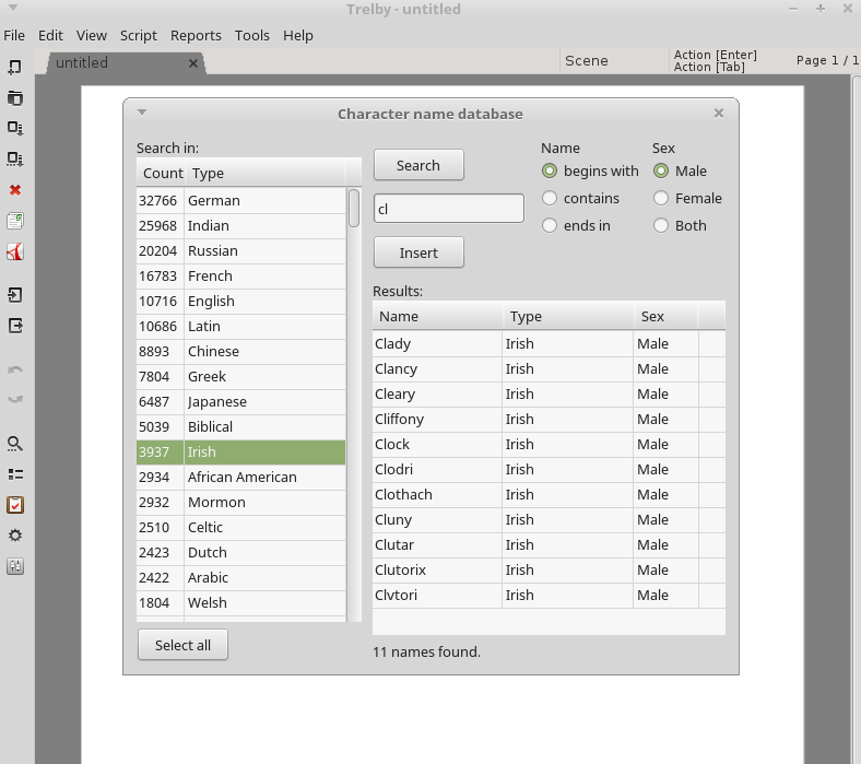 http://www.trelby.org/ In the examples below I limited the search to Male, starts with "cl" and chose "English" – which resulted in 37 names. If I changed the nationality to "Irish" I got 11 name (second example). As you can see in the screenshots, lots of choices. |