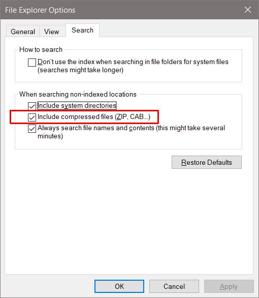 Oh, I just remembered that I also specifically set that the search should include compressed files (Computer -> Tools -> Folder options).