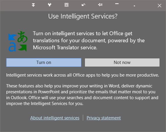 Seems to me that having or not having Intelligent Services (IS) checked makes not one scrap of difference to the current Editor Pane functionality. I say current because I'm wondering if... as they add functionality to grammar checking... they will do what Language Tools have done, make it a chargeable service - LT want $AU79 per annum for their latest and greatest... ouch. One feature that does need Intelligent Services is, unsurprisingly, Word's Translation tool, if it's unchecked you get this If the Editor Pane needed IS then it's reasonable to assume it would have a similar popup. Yes I did check every option in Settings, and I did test most conditions. BR |